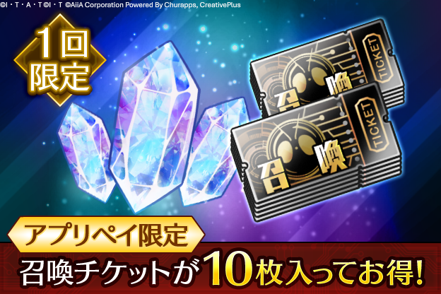 「有償クリスタル×50個」、「無償クリスタル×100個」、「10回召喚チケット」のセットが驚きの100円でご購入いただけます!(ご購入は1回限定となります)